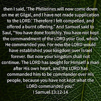 As we continue with the base scripture of the month of Breach of Contract in September we go the Word of God to 1st Samuel 13:12-14. In these verses God has told Saul to wait for Samuel so the